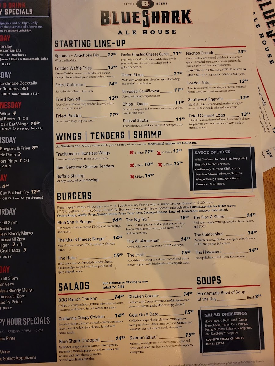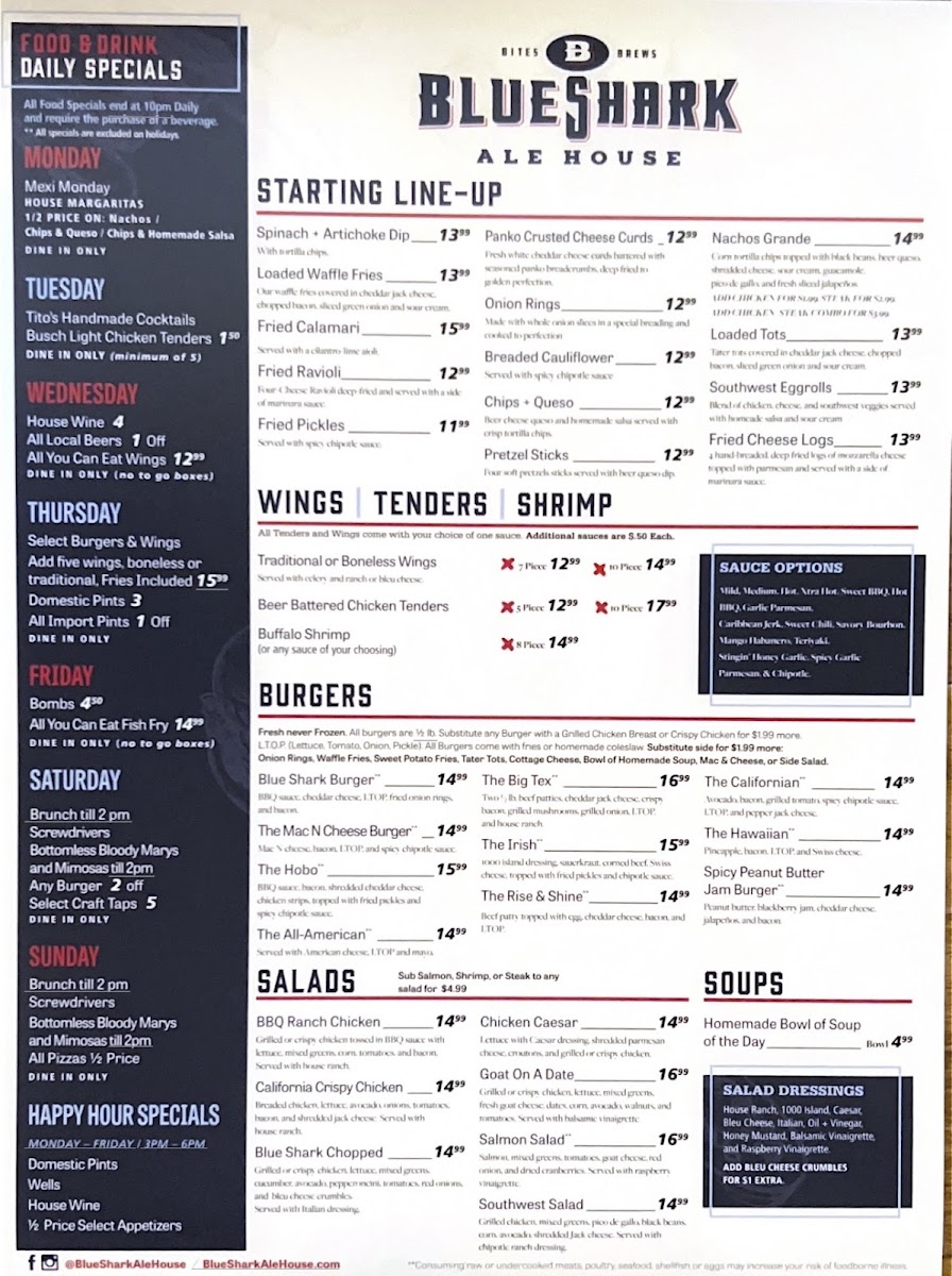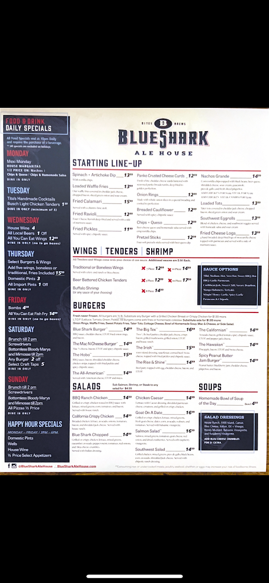 Welcome to Blue Shark Ale House, the ultimate destination for food lovers and craft beer enthusiasts located at 165 S Jordan Creek Pkwy, West Des Moines, IA. This vibrant locale boasts a menu filled with mouthwatering options, from their renowned all-you-can-eat wings on Wednesdays to specially crafted burgers served with a side of select craft taps for just $5 on Saturdays.